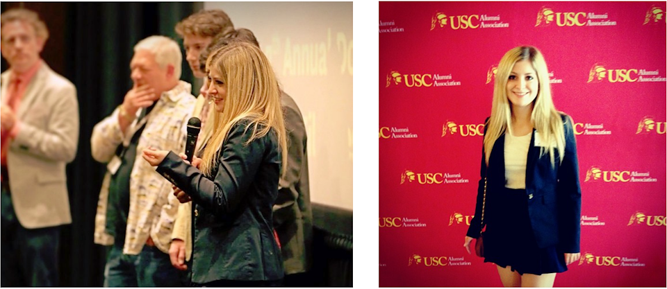 Reedy speaking at a Q&A about the characters and actresses of “Truth or Drink” (left below) and Reedy at the 7th Annual Don Thompson Film Festival, where the film premiered (right below).