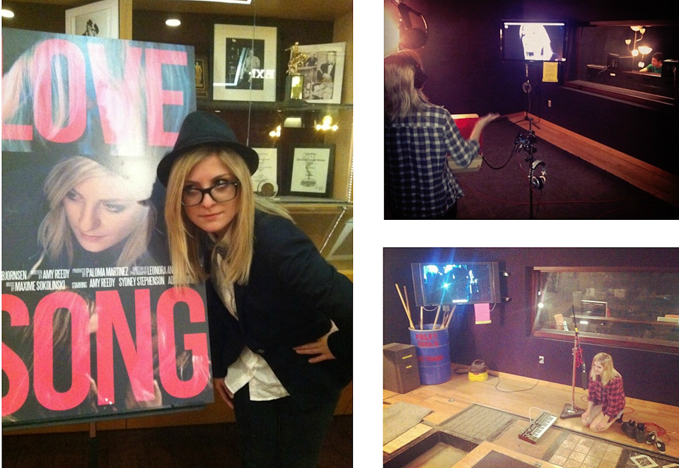 Below left: Reedy at "Love Song" screening." Below right: Reedy doing ADR and Foley for "Love Song."