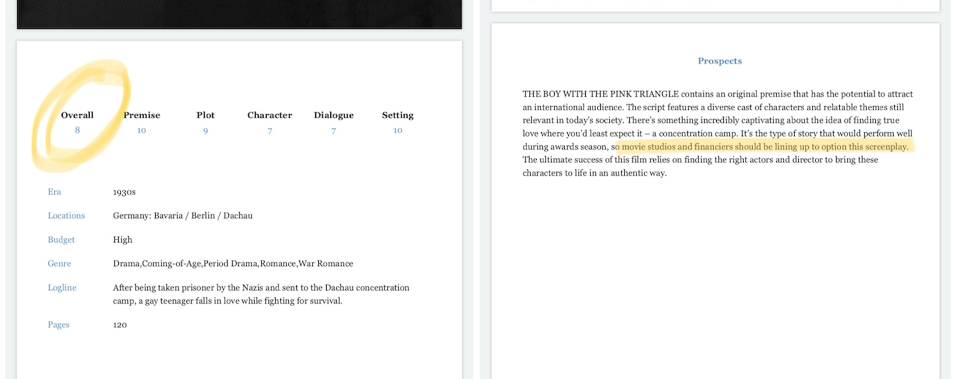 “The Boy with the Pink Triangle” is getting astounding feedback from competitions. It has been a Trending Script on The Black List website, where it was called “incredibly captivating," "emotionally-driven," and "inspirational.” They went on to say that “movie studios and financiers should be lining up to option this screenplay.”