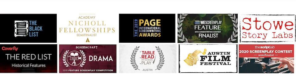 Awards: Academy Nicholl Semifinalist, The Black List "Trending Script" (score: 8), 2x WeScreenplay Finalist ('18 and '21), Coverfly's The Red List "Top Historical Screenplay of All-Time" and "Top Historical Feature of All-Time," Coverfly Top 1% of all projects, Stowe Stories Lab Alumn (with scholarship), 2x Screencraft Drama Semifinalist ('18 and '20), ISA’s Table Read My Screenplay (Austin) Semifinalist/Top 100, The Script Lab Semifinalist, Austin Film Festival Second Rounder, PAGE Awards Quarterfinalist