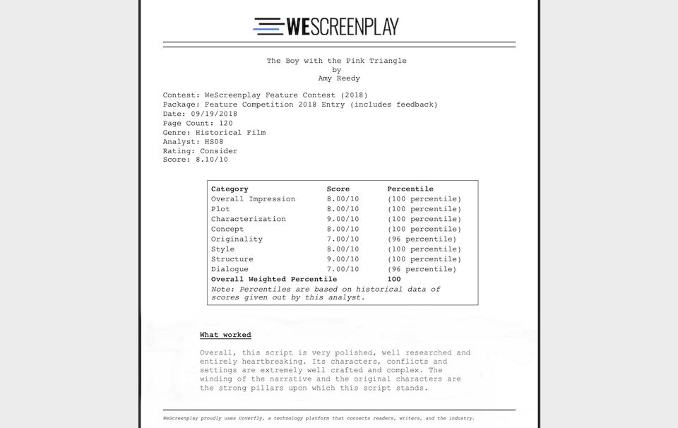 WeScreenplay even gave it the rare score of 100%, calling it “very polished, well researched and entirely heartbreaking," as well as "extremely well crafted and complex," with a "winding narrative” and “original characters.”